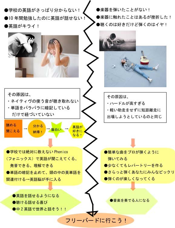 そして学校では絶対に教えないPHONICS、フォニックスとは文字と発音を結びつける音声学習法です。ネイティブが使っている音を知らないと、聞こえてこないし真似できません。実はこれはとても重要なのです。